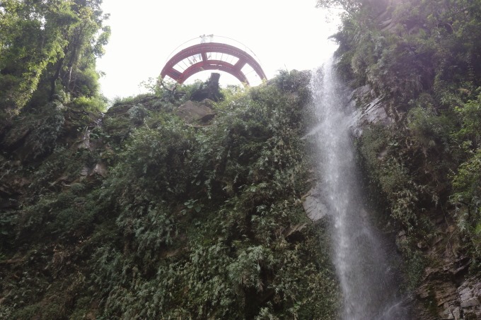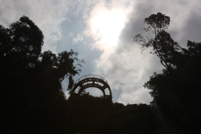 繞完一圈,回步道口乘接駁回龍鳳瀑布停車場,此時人潮湧現相當熱鬧,於小吃攤買炸芋粿享用休息。再往內遊龍鳳瀑布,行北岸水泥道沿溪上溯,分別先訪鳳瀑布、龍瀑布。鳳瀑布秀致清爽,另稱雌瀑布。龍瀑布高懸奔流,稱雄瀑布,此瀑可見高掛於半空中的天空步道。
