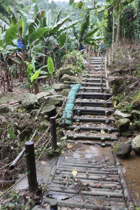 離鳳龍瀑布往紅菜坪古道。古道乃清朝時前往埔里的必經之路,故熱鬧非凡稱為「不夜城」。古道不長約450公尺,沿溪修建,過涼亭後可看古道舊石板。古道出口接產道,再走2.8公里的道路回步道口取車,實在不划算,故原路來回為佳。時近中時,至爽文「阿貞雜菜麵」用餐,麵多,但味不佳。