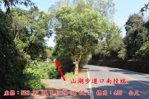 ↓14:21 山湖步道口南投端。將車子停於步道口旁,沿水泥產道下行。 座標:N23 53 28.8 E120 38 00.3 標高:435 公尺