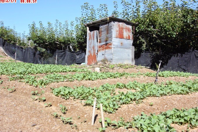 ↓07:15 (00:06) 見到鐵皮民宅後,看到塑膠棚車庫後方為菜園入口【取左】走進菜園。 座標:N24 19 21.6 E121 18 13.5 高度:1916 公尺