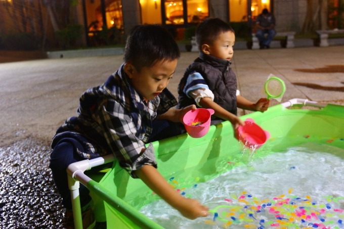 買完米粉後往煙波大飯店,下午倆兄弟就在飯店玩兒童遊樂設施,玩積木小火車、球球池、溜滑梯。16點半至戶外玩氣墊式溜滑梯”飛天滑梯”。17點半再去餐廳用餐。餐畢再玩一次兒童遊樂設施,這次又多加了趣味撈金魚,只是金魚變成塑膠金魚,考驗記憶力的九宮格兌兌樂,小茶壺很厲害,都記得起來。回房間,把浴缸水放滿,倆兄弟在裡面玩的不亦樂乎。