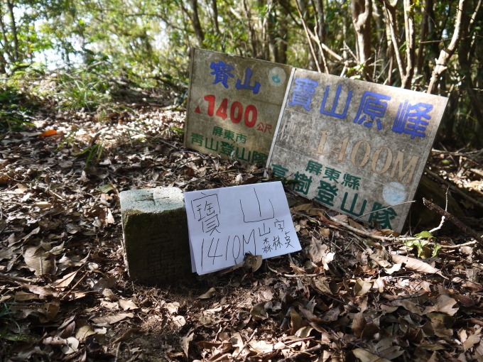 ↓09:06 (00:01) 寶山又稱寶山原峰、月仙山,標高1410公尺,山字森林三角點。來回約15分鐘。 座標:N23 02 26.0 E120 42 14.8 GPS高度:1419 公尺